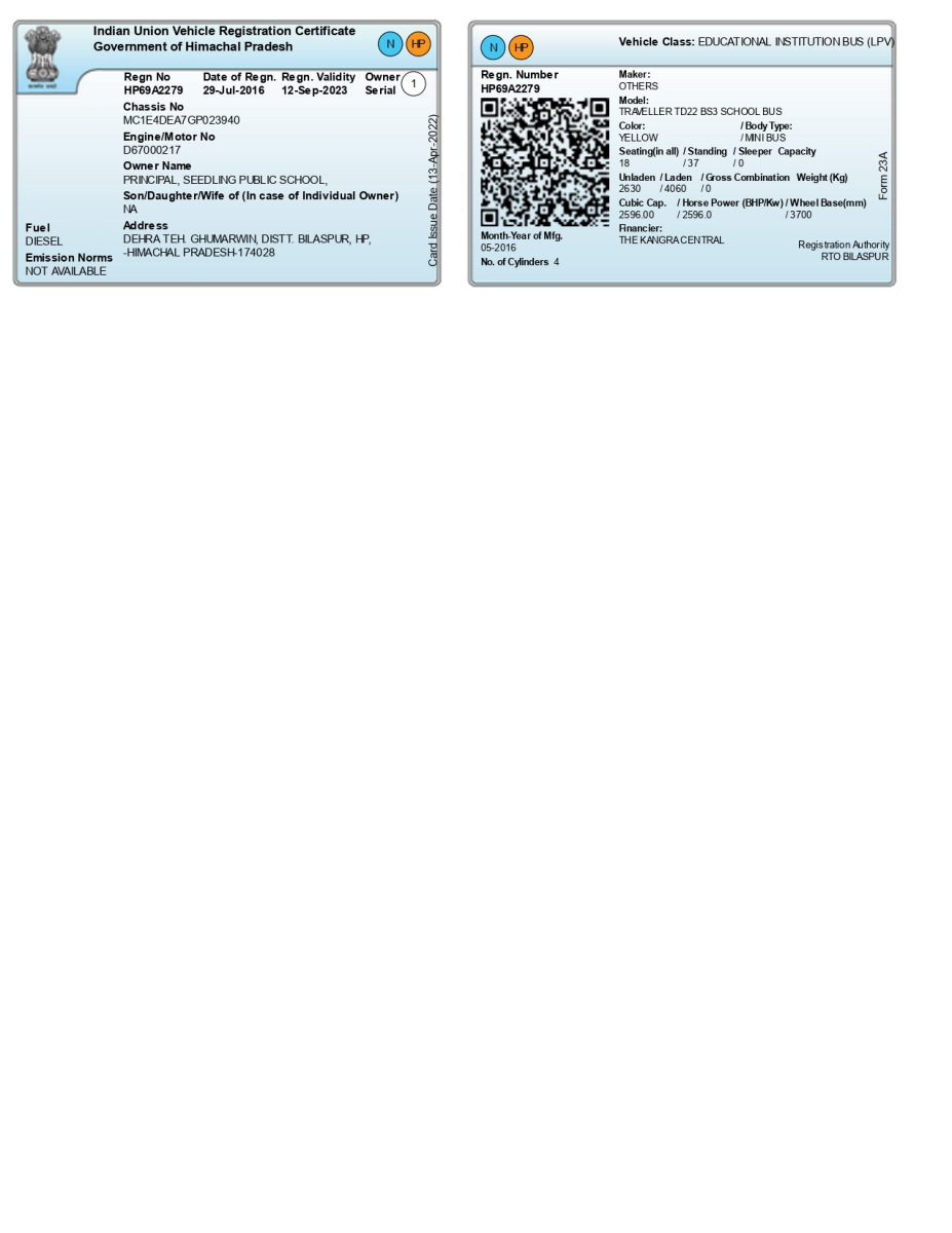 Our Transportation 23 Nov,2021 adminLeave a comment ShareDriver License Sanjeev-Kumar Image 1 of 3 RC of Vehicle RC-HP69A2279_page-0001 Image 4 of 4 Route Permit Route-Permit-6711 Image 1 of 3 Fitness Certificate Fitness-2279 Image 1 of 2